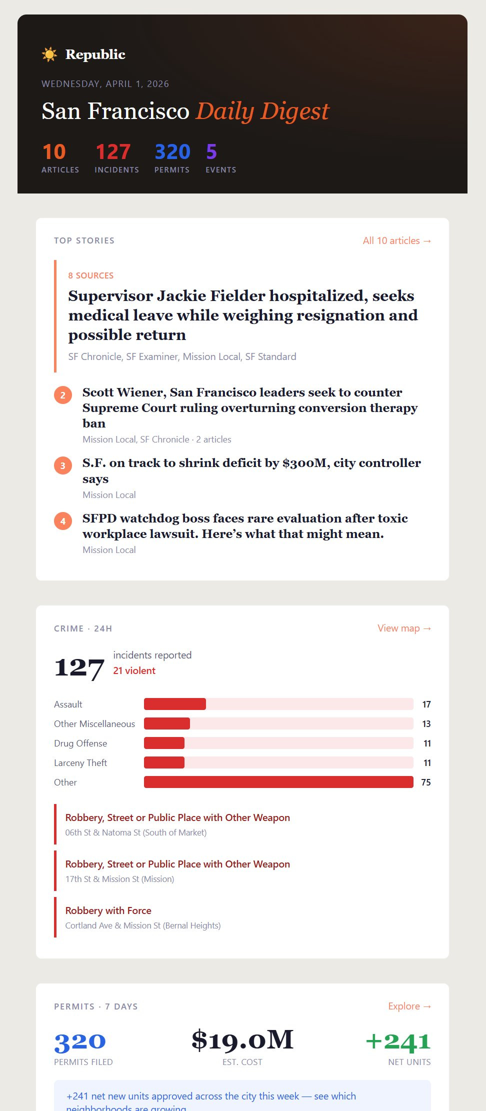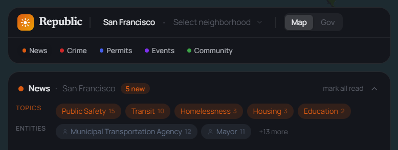 With Republic, you can track political news, crime, permits, events, community groups, and more across the city and in your neighborhood!